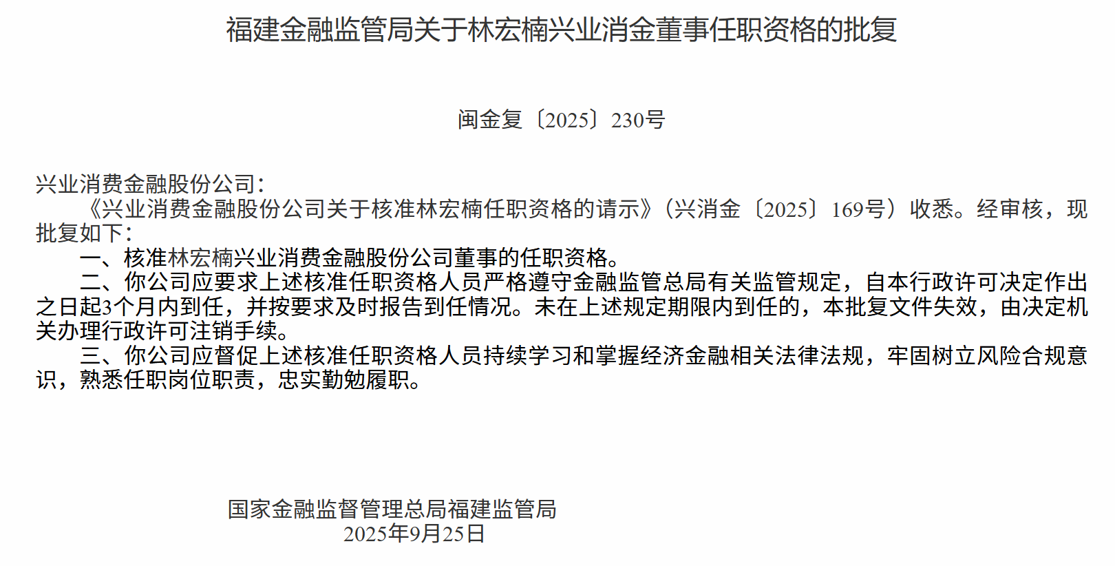 10月9日,福建金融监管局发布关于林宏楠兴业消金董事任职资格的批复,核准林宏楠兴业消费金融股份公司董事的任职资格。